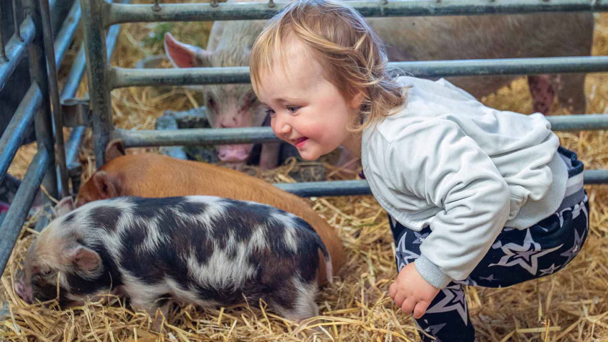 Two-year-old Maia cuddles lambs at the Show.